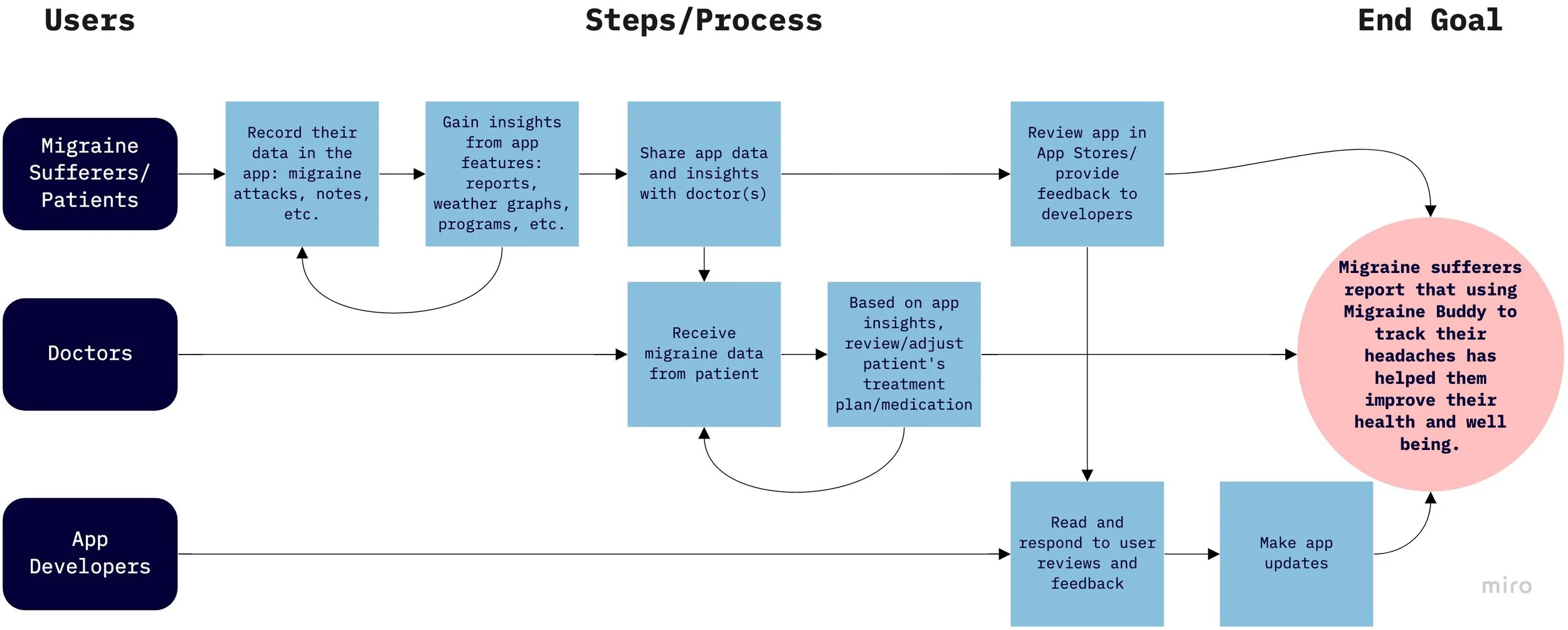 This map shows all the groups of people that interact with the app, directly or indirectly. This was where I refined the goal: for Migraine Buddy to help migraine sufferers feel better.